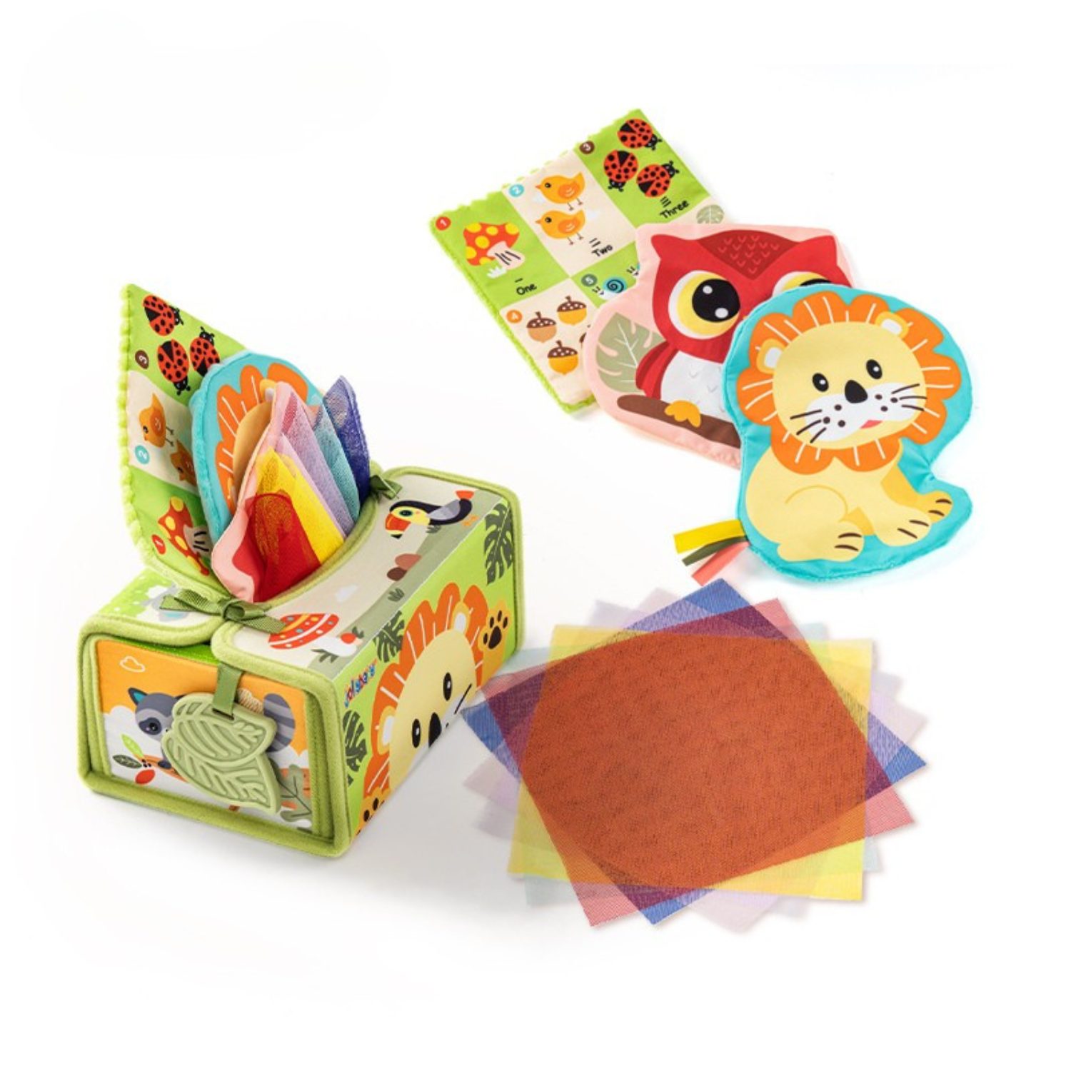 Το σετ περιλαμβάνει ένα μαλακό κουτί δραστηριοτήτων και πολύχρωμα υφασμάτινα “μαντηλάκια” που το μωρό μπορεί να τραβά, να πιάνει και να εξερευνά ξανά και ξανά. Επιπρόσθετα κάθε πανάκι διαθέτει διαφορετική υφή και έντονα χρώματα που ενισχύουν την αισθητηριακή ανάπτυξη και διεγείρουν την όραση. Παράλληλα, τα χαριτωμένα ζωάκια και τα σχέδια με αριθμούς βοηθούν το παιδί να κάνει τα πρώτα του βήματα στη μάθηση μέσα από το παιχνίδι.